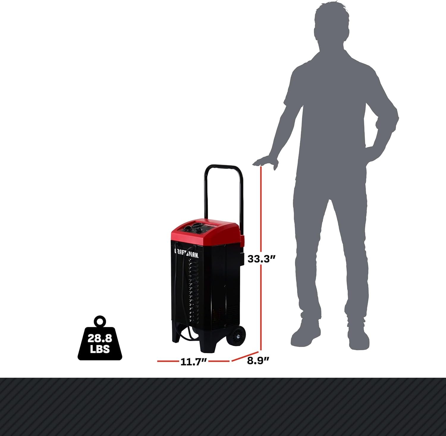 AC Powered – This unit, with 6-foot power cord and front-mounted booster cables, must be plugged in during use