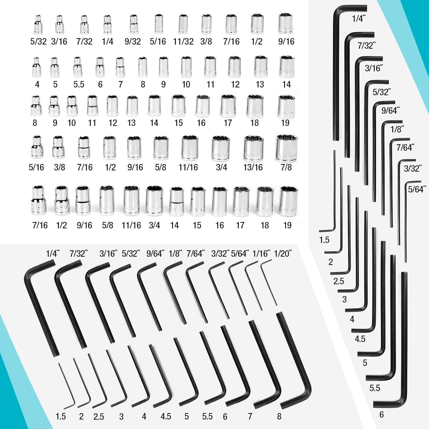 What You Get – 3pc Ratchet Wrench; 2pc Spark Plug Socket; 7pc Extra Bar; 1pc Spinner Handle; 1pc Adaptor; 57pc Sockets Set; 18pc Wrench Set; 40pc Hex Key Set; 20pc Bit Set Please refer to the details page below for the specific size of each tool.