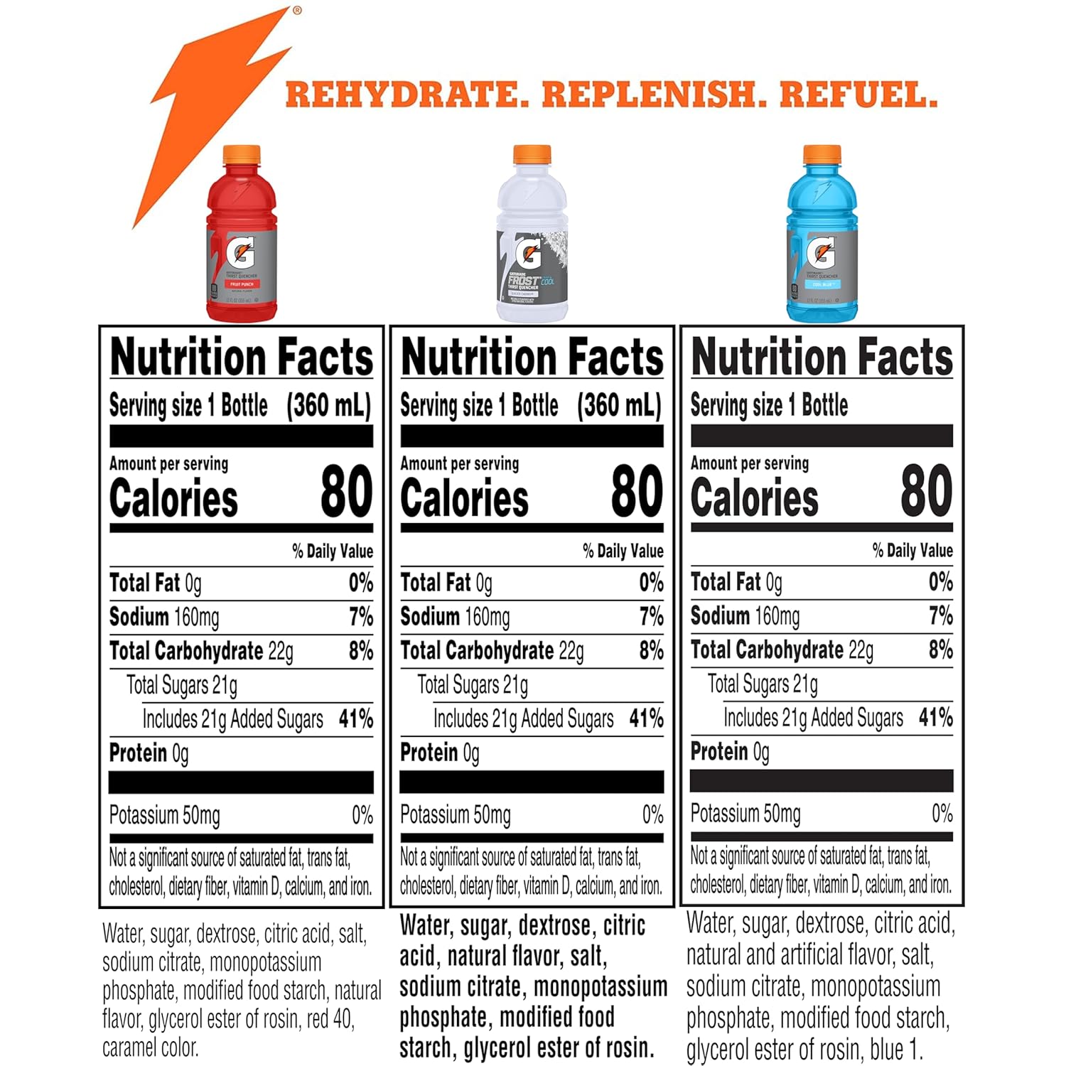 - Includes 18 12 fl oz bottles of Gatorade Thirst Quencher: 6 Fruit Punch, 6 Glacier Cherry, 6 Cool Blue