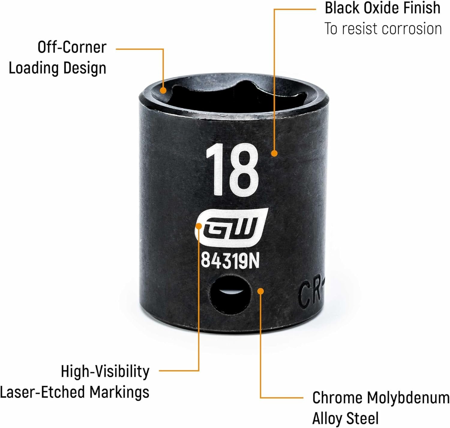 Black oxide finish used on 3/8” and ½” drive impact sockets for corrosion resistance