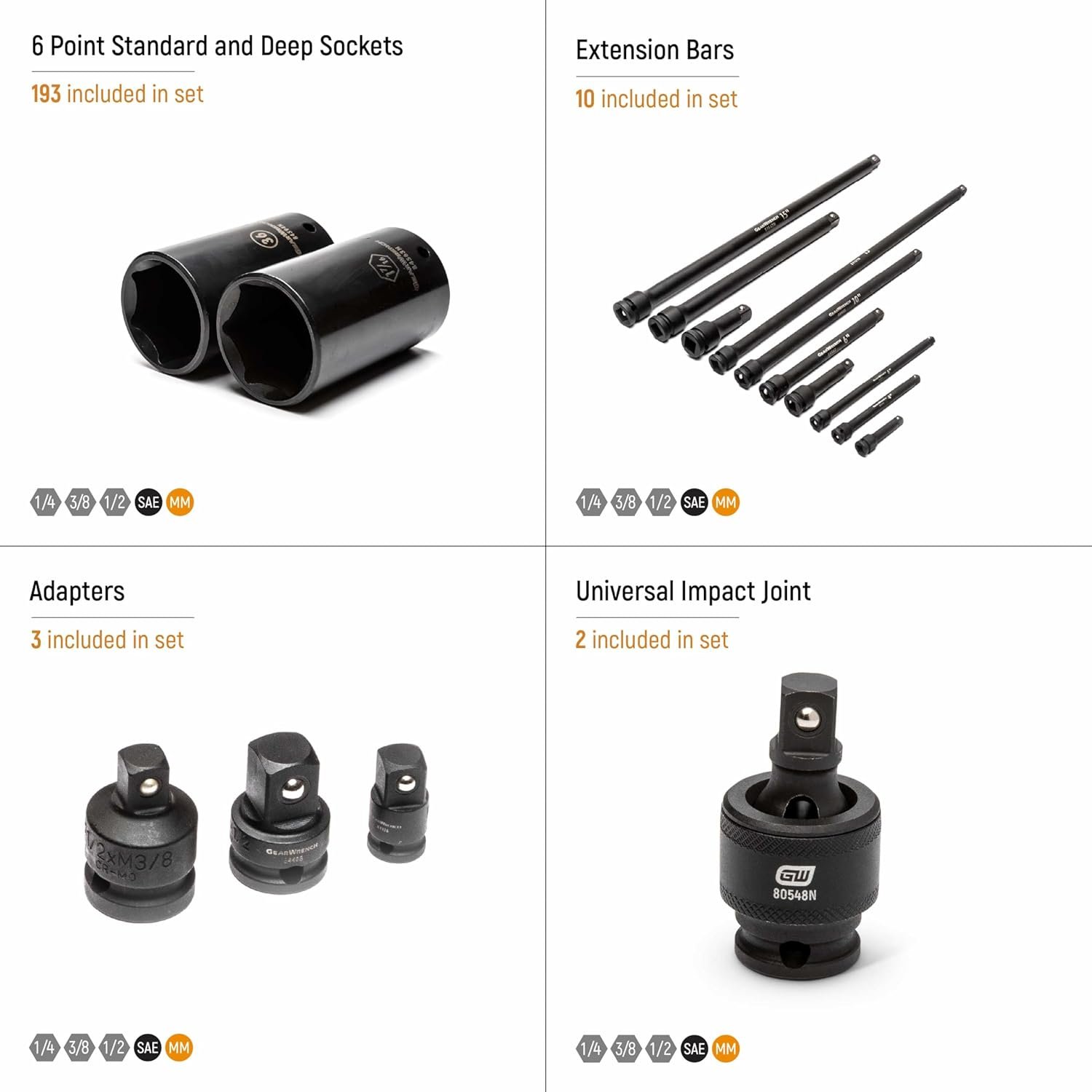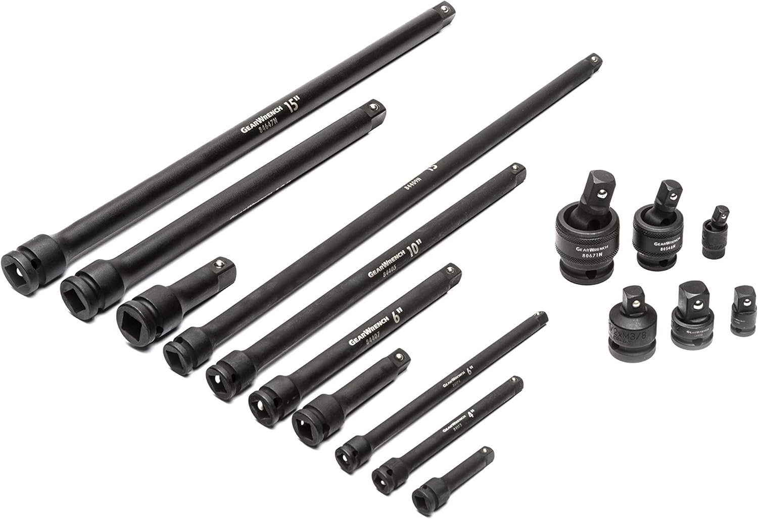 Manganese phosphate finish on the impact extension bars, universal joints, adapters, & ¼” drive sockets for corrosion resistance