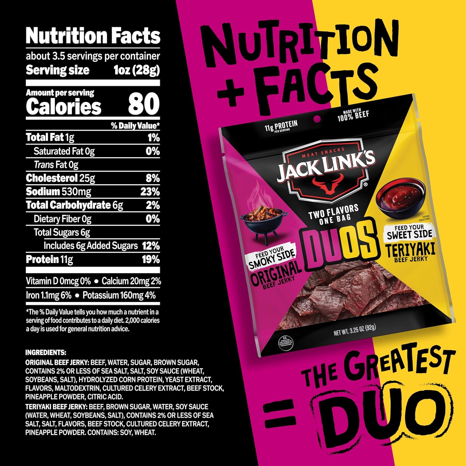 - TWO FLAVORS, ONE BAG: Enjoy the bold Original flavor alongside the sweet-savory perfection of Teriyaki beef jerky. Jack Link’s Original and Teriyaki flavors are what put beef jerky on the map. Now you can have both at once and fuel your beast with DUOs