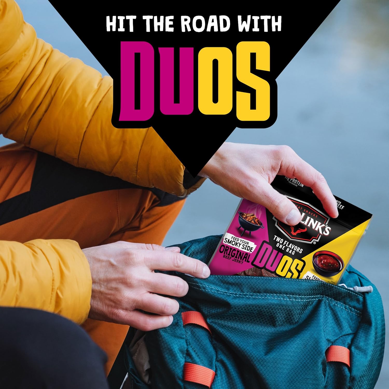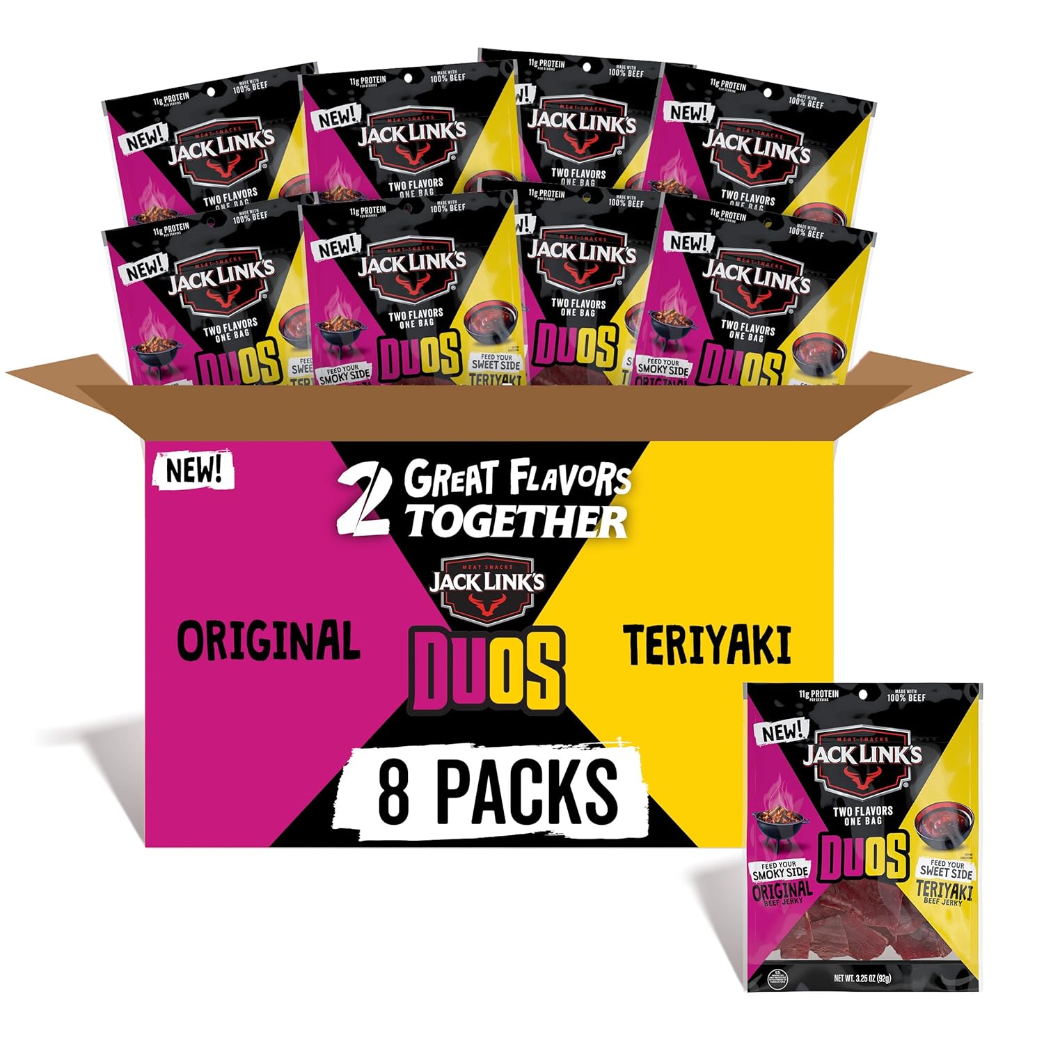 - 3.25OZ SNACK SIZED BAGS: Live life on the go with conveniently packed Jack Link’s DUOs. This bulk meat snack package contains 4 bags of snackable and shareable Original and Teriyaki DUOs jerky. Pack in pantries or lunches, take hunting or to work