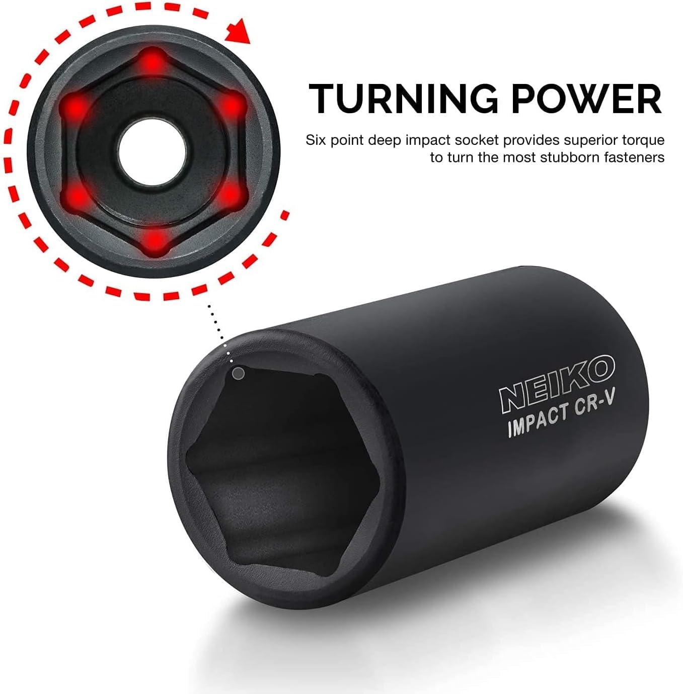 6 POINT DESIGN: The 6-Point hex 1/2 impact socket set design prevents round-off on nuts and bolts under high torque exertion and hammering stress from the use of an impact wrench or electric wrench with a strong output.