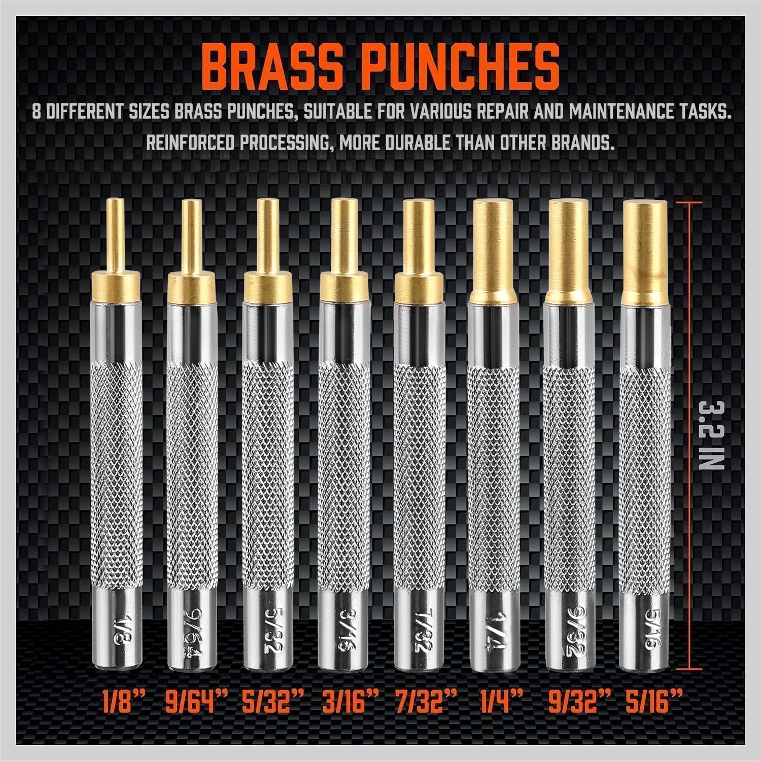 • BRASS PUNCHES – 8 sizes from 1/8″ to 5/16″, designed to protect delicate surfaces where steel punches may cause damage